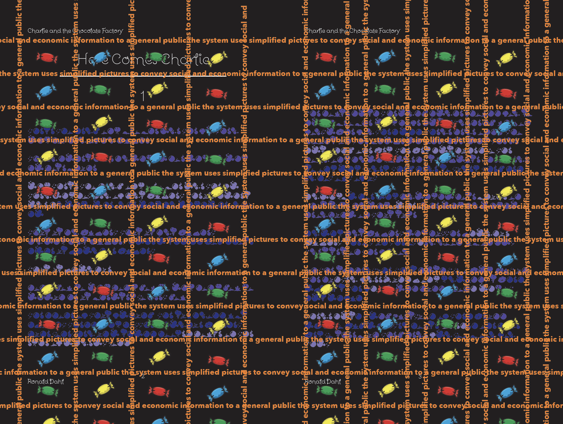 This is a book that serves as commentary for the content of the book itself; bringing the viewer’s awareness not only to the book: Charlie and the Chocolate Factory, but also to the fact that they are examining something that is creating commentary about itself within the world at large. I created a thematic and progressive series of graphics consisting of found images, original book text, and invading typography that work to achieve and embody the metabook philisophy.
